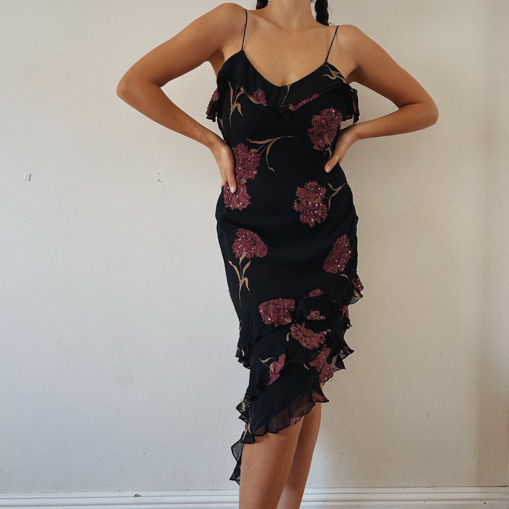 Experience ethereal beauty in our pure silk Fairy Beaded Ruffled Dress. The asymmetrical design is accented with delicate beads, adding a touch of whimsy to the floral print. With layers of ruffles on the skirt, this dress exudes texture and fairy vibes. Elevate your style with this stunning dress.