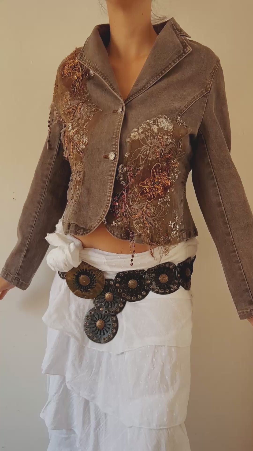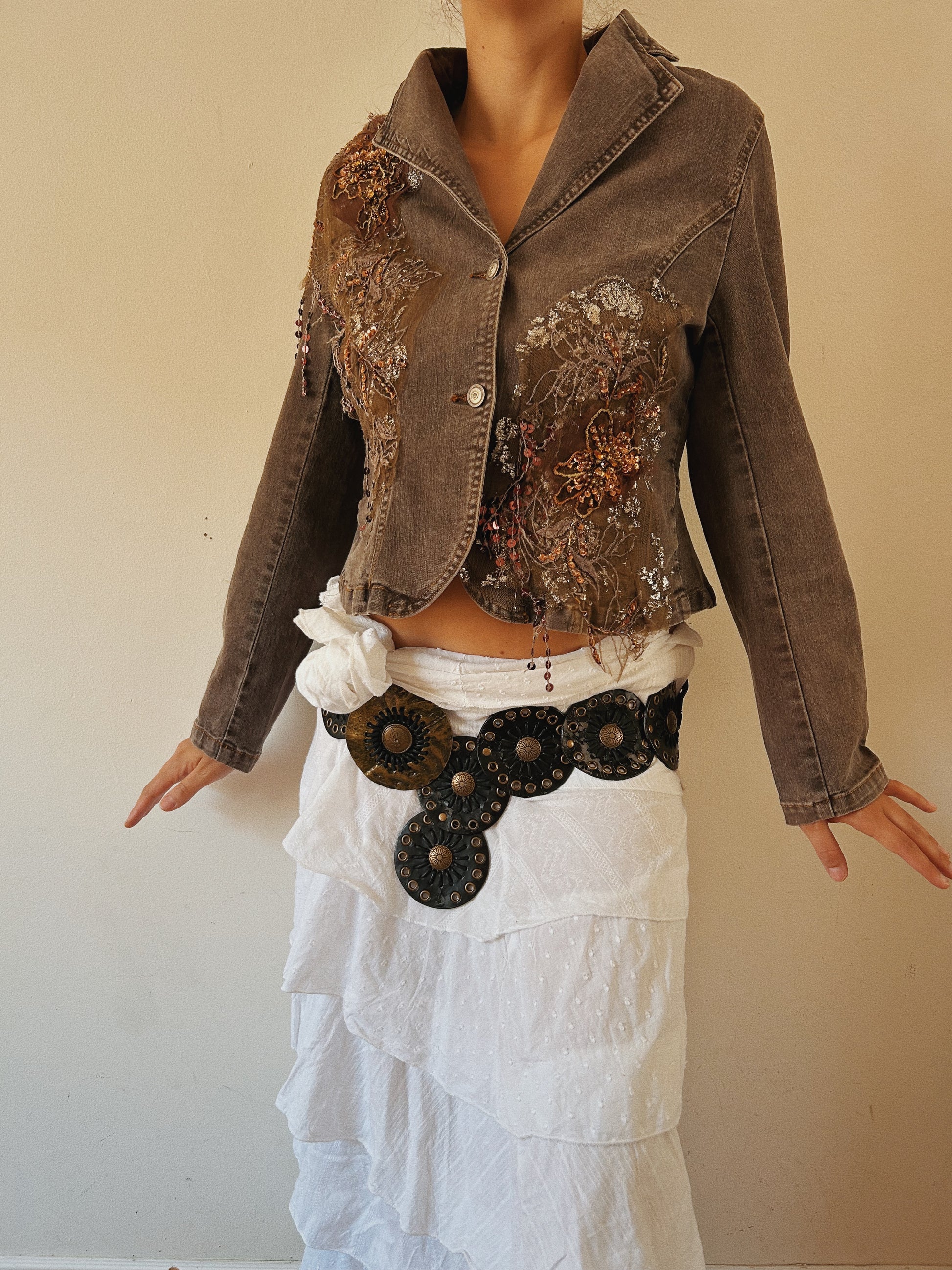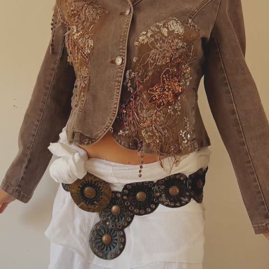 This denim jacket is not your average piece of outerwear. With intricate fairy grunge embellishments including beads, fringe, and sequins, it adds a touch of whimsy to any outfit. Its fitted button up design and flattering shape will cinch your waist for a flattering look. Elevate your style with this fairy embellished denim jacket.