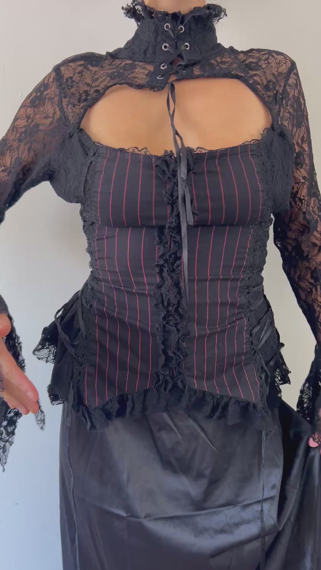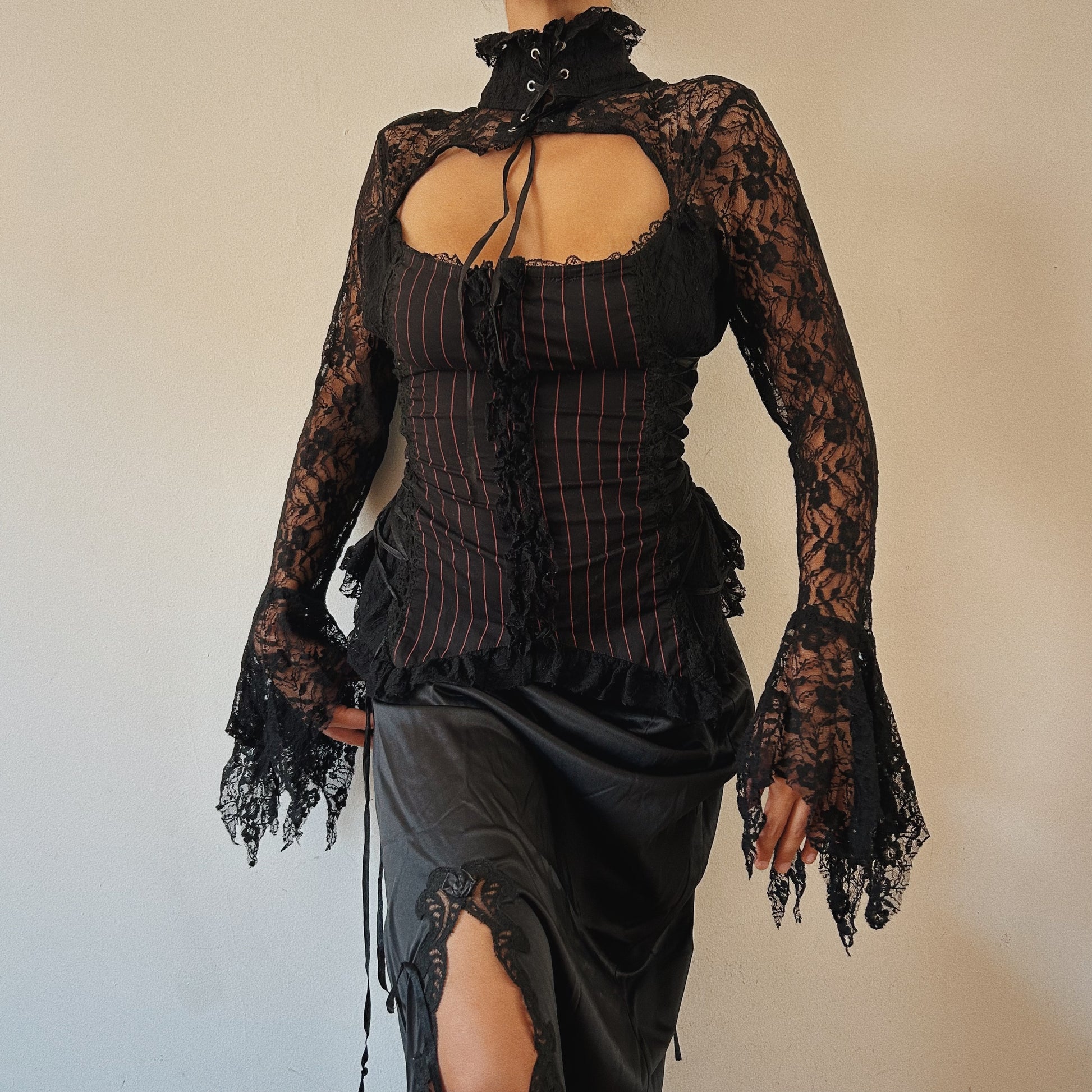 Step into your dark romance era with this stunning fairy grunge lace corset top. Featuring sheer black lace long sleeves with dramatic bell cuffs, a sweetheart bust cut-out, and delicate lace-up choker detail, this piece captures the perfect balance between gothic elegance and ethereal fairycore vibes.