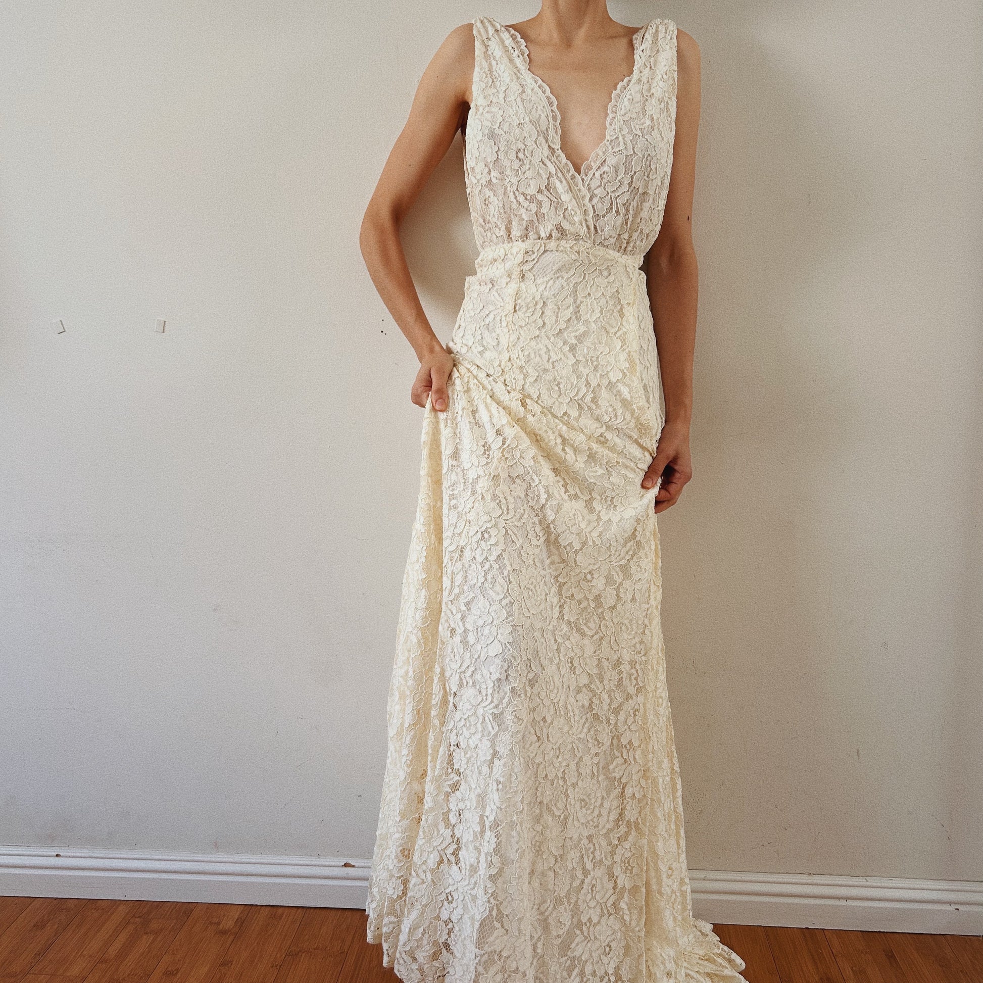 This gorgeous bridal dress features a completely laced plunge neckline and an open back for an enchanting and bohemian feel. The wrap design adds a comfortable and flattering fit, perfect for a beach wedding. Elevate your look with this stunning dress.