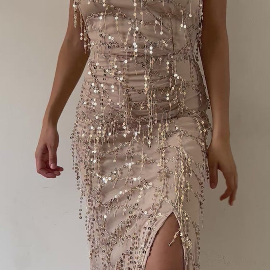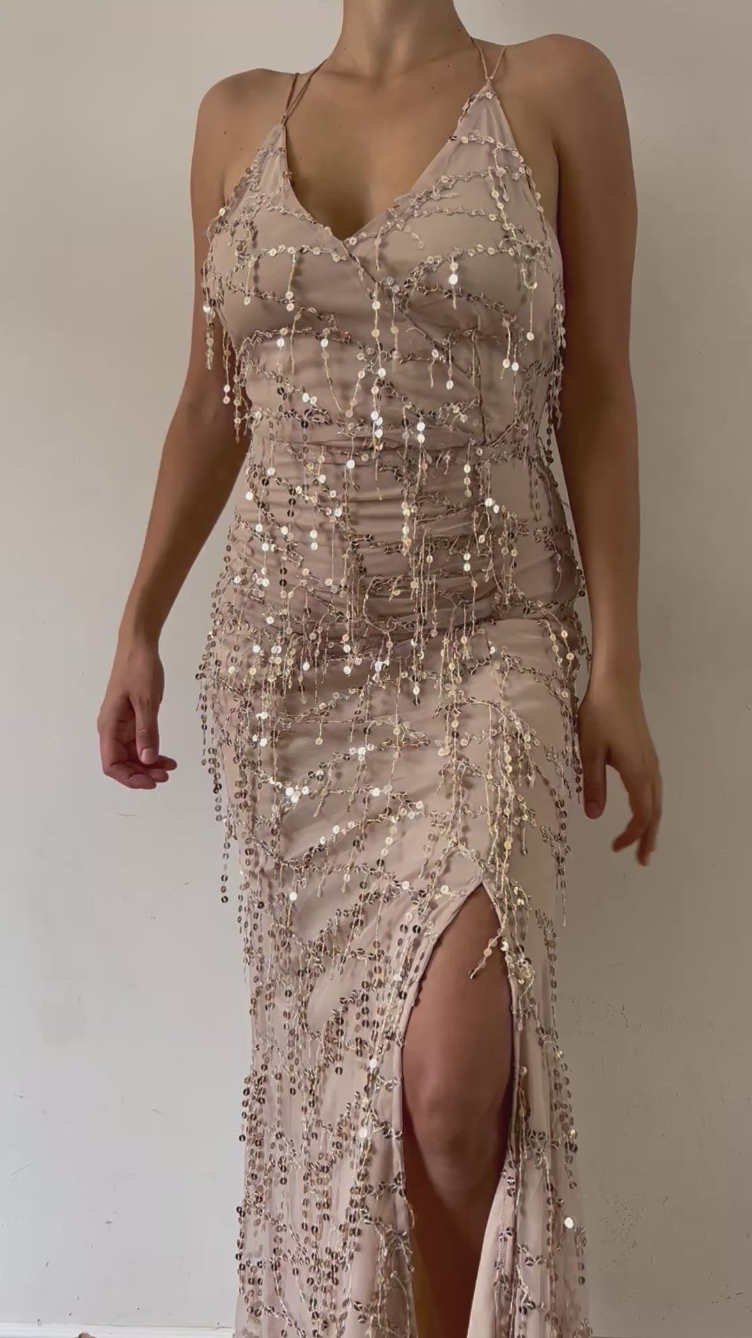 Get ready to stun in our Sequins Nude Maxi Dress! With a gorgeous criss cross back and leg-baring slit, this fitted dress will turn heads at any evening event or holiday party. The nude and golden sequins add a touch of glamour, making you the center of attention. Elevate your style game with this must-have dress.