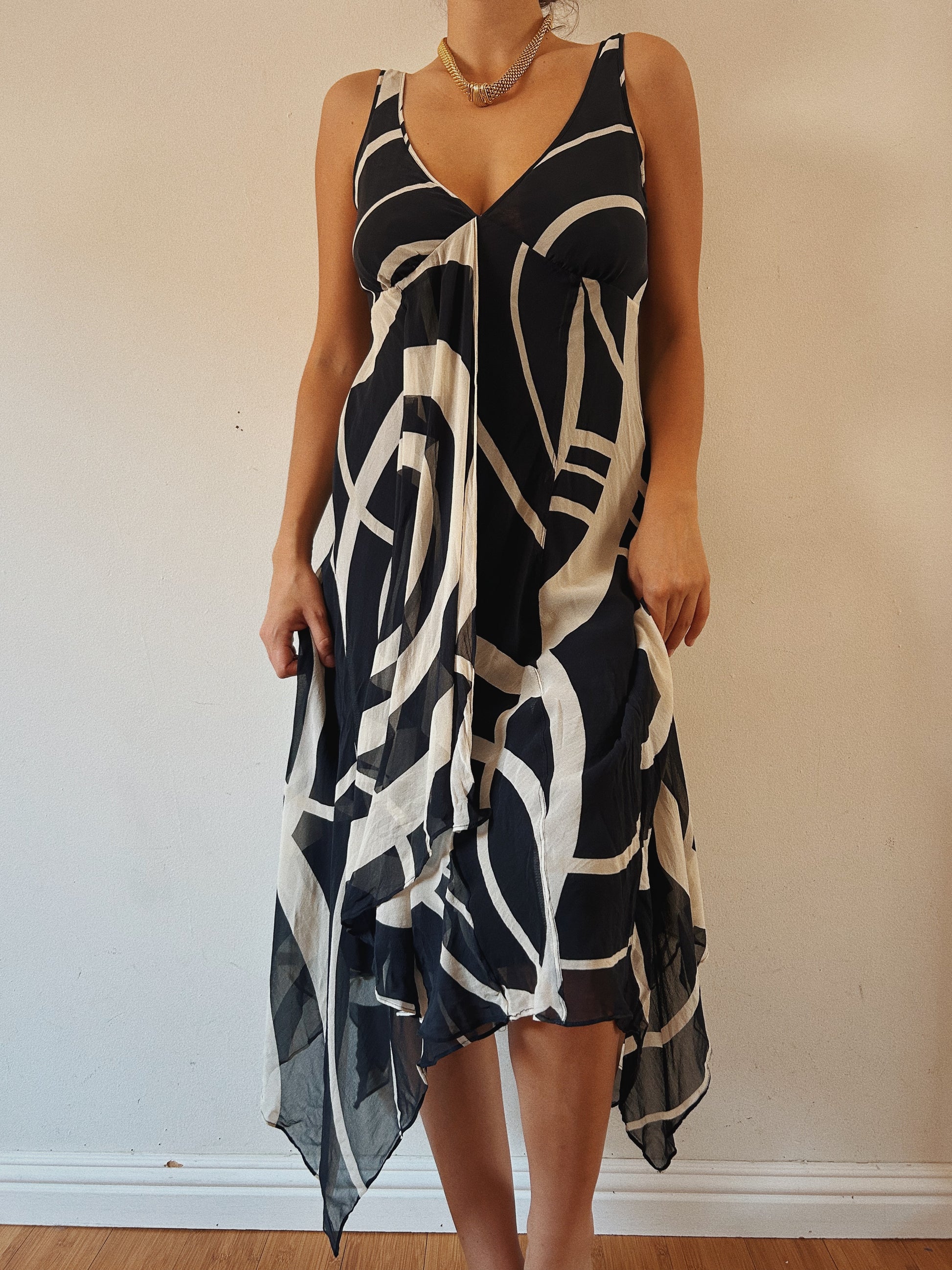 This elegant dress features an asymmetrical design with a flowing black and white swirl pattern, crafted entirely from pure silk.