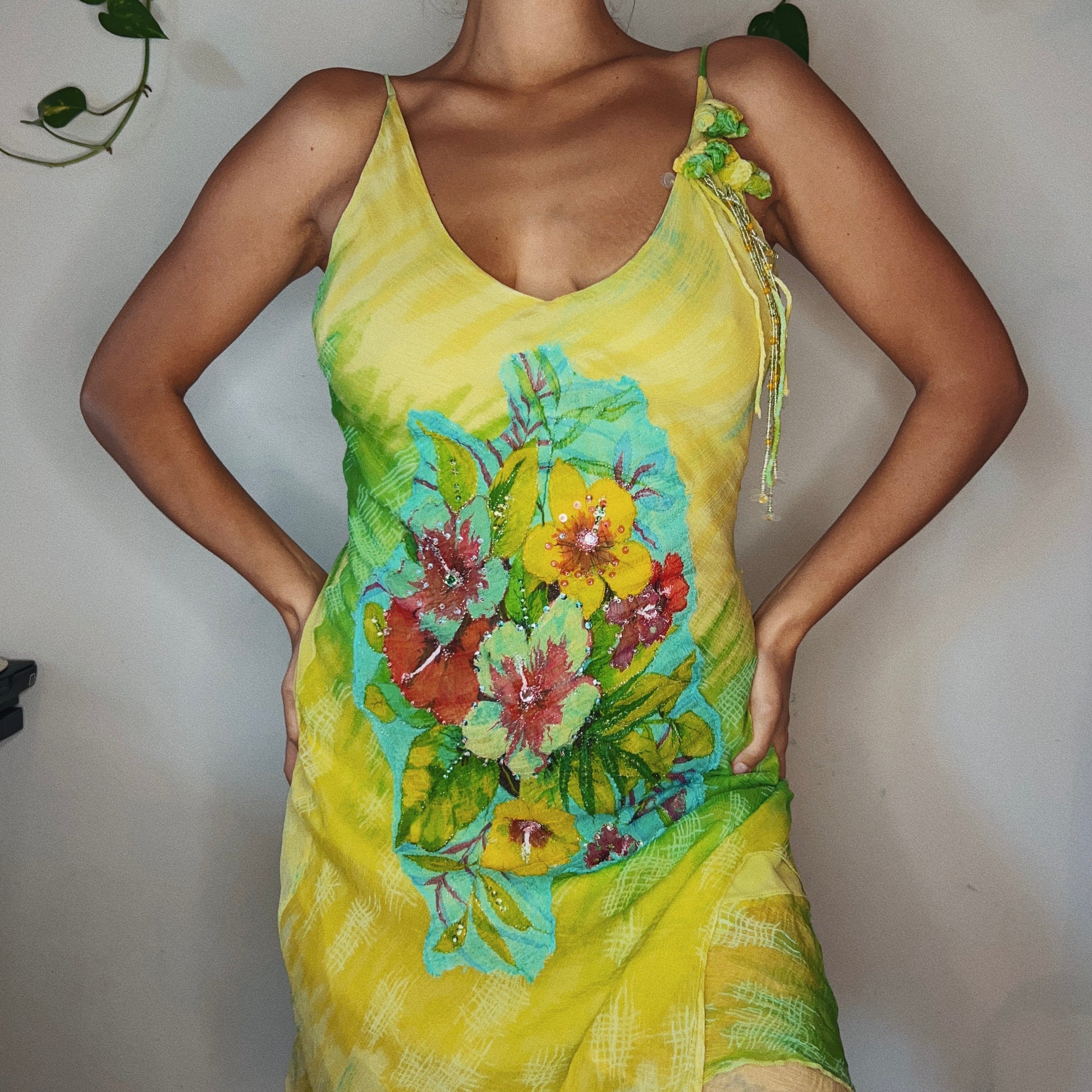Experience the iconic Viral Derhy Jungle Dress. Designed by renowned designer René Derhy, this dress features sparkling sequins, delicate embroidered florals on the strap, and a layered design for a bold and elegant look. Make a statement and turn heads in this one-of-a-kind dress.