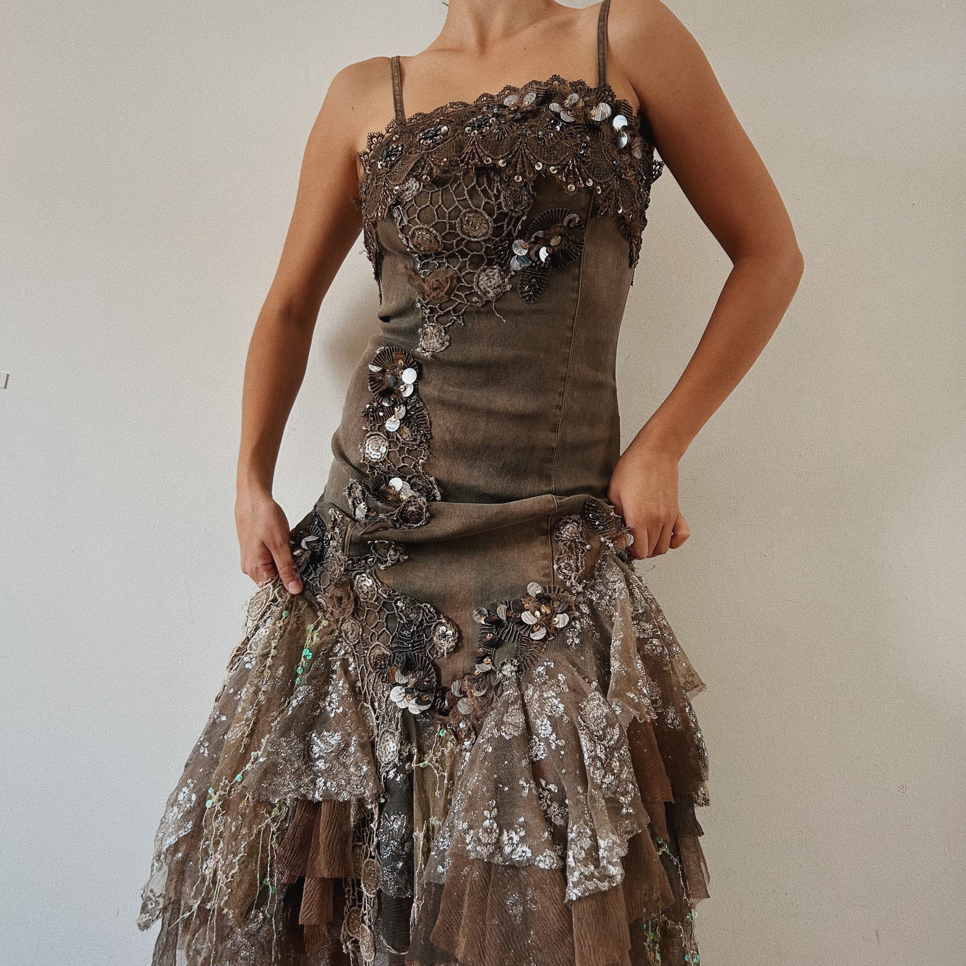 This Fairy Grunge Denim Embellished Dress features a rare design that combines fairy-inspired elements with a grunge denim look. Embellished with sequins, beads, and lace, this one-of-a-kind dress will make you stand out from the crowd. With a layered skirt, it offers a unique and beautiful look for any occasion.