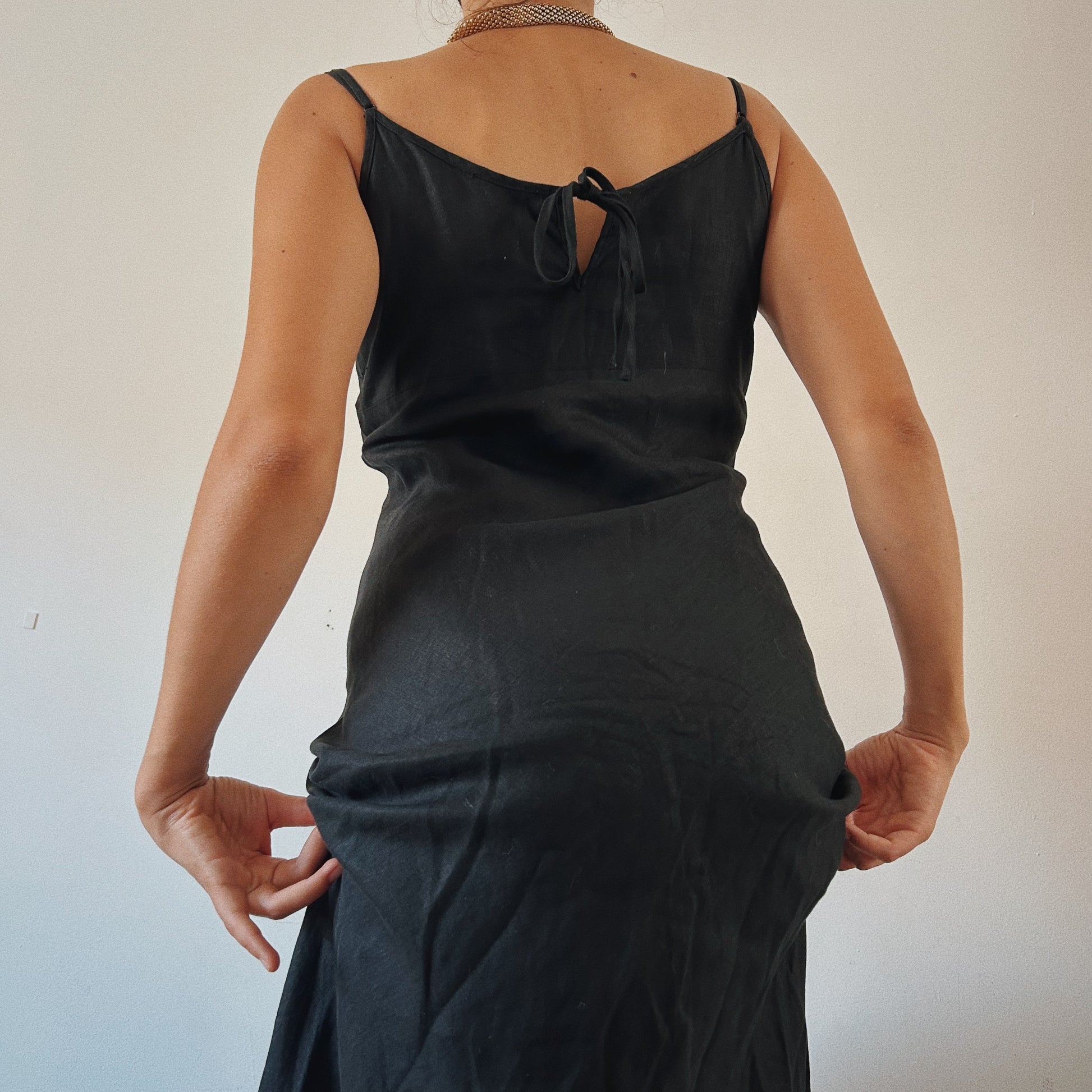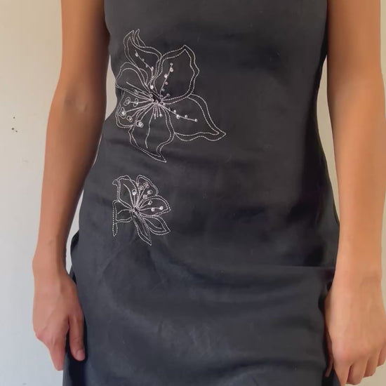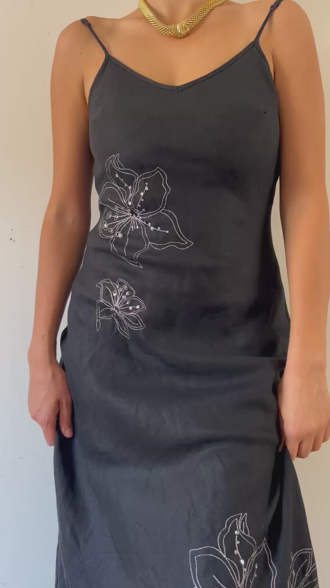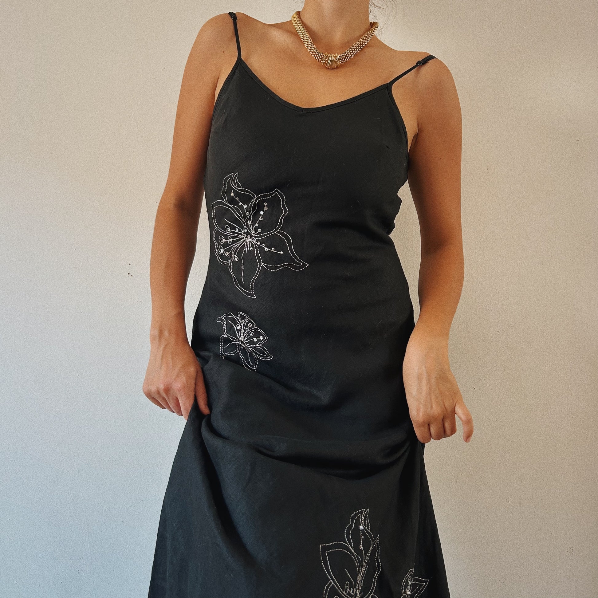 This beautiful maxi dress features black linen fabric with embroidered florals and delicate sequin detailing, adding a touch of elegance to the overall design. Not only is it visually stunning, but it also offers a flattering fit, making it a must-have.