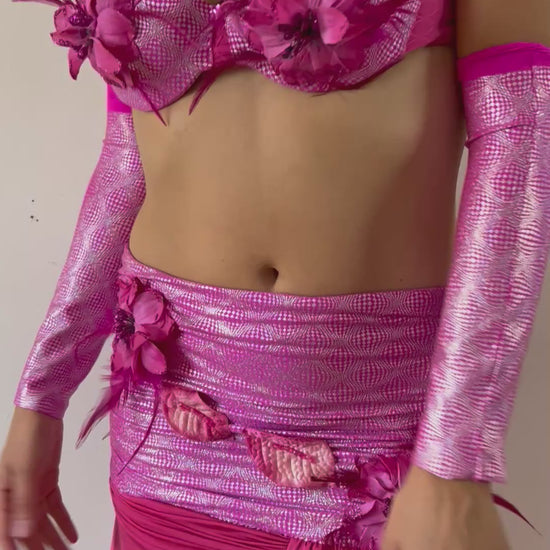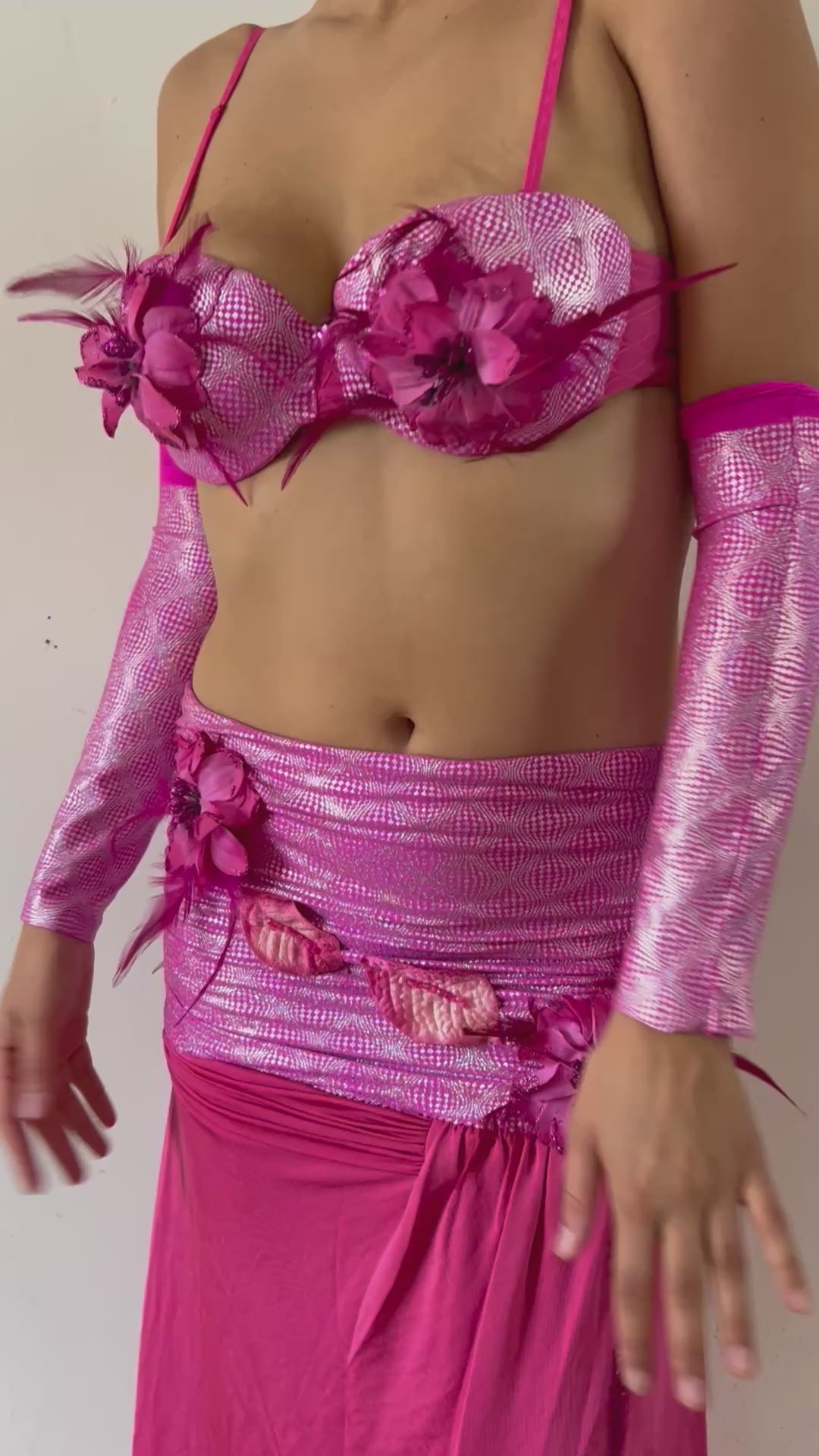 Our Handmade Pink Floral Set is expertly crafted by our mom. The fitted hot pink skirt and bra with 3D flowers are perfect for a music festival. The set also includes 2 arm sleeves and a headband for a complete look. Look and feel your best in this unique and stylish ensemble.